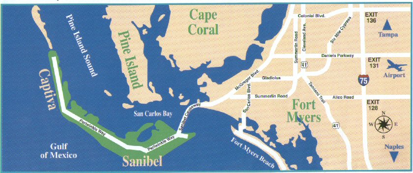 (239) 768-1000 Located in Fort Myers, off Exit 131 on 1-75, providing direct access to Sanibel-Captiva via an easy 30- to 45-minute drive. Currently under expansion, a new airport complex is expected to open in 2005. Most major airlines serve the airport.